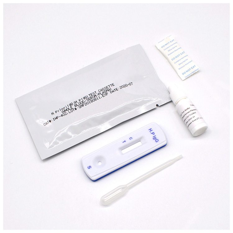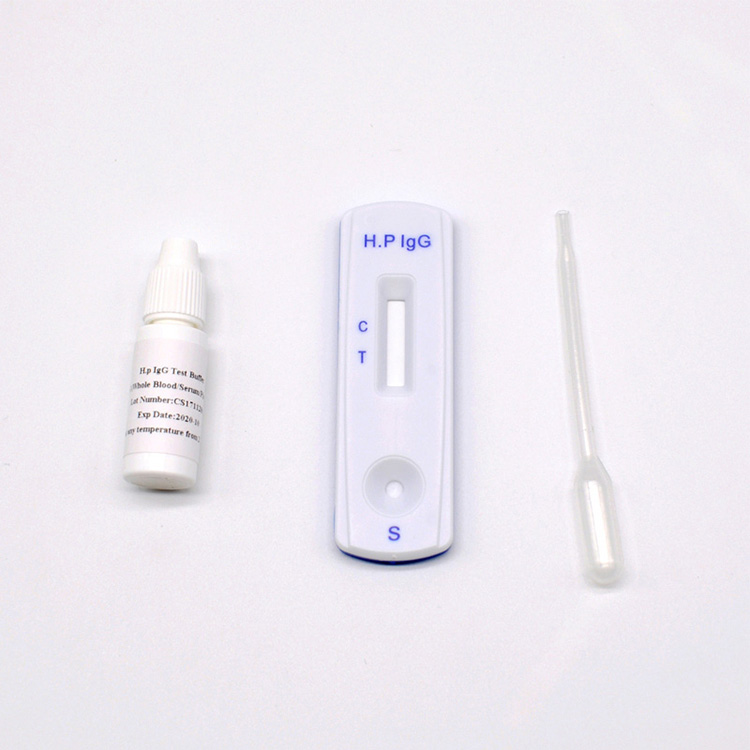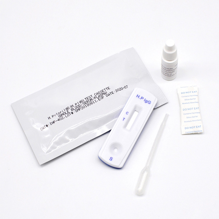 H.pylori antikroppstest: H. pylori Antibody Rapid Test Device (helblod/serum/plasma) är en snabb visuell immunanalys för kvalitativ presumtiv detektering av specifika IgM- och IgG-antikroppar mot Helicobacter pylori i humant helblod, serum eller plasma exemplar. Detta kit är avsett att användas som ett hjälpmedel vid diagnos av H. pylori-infektion.